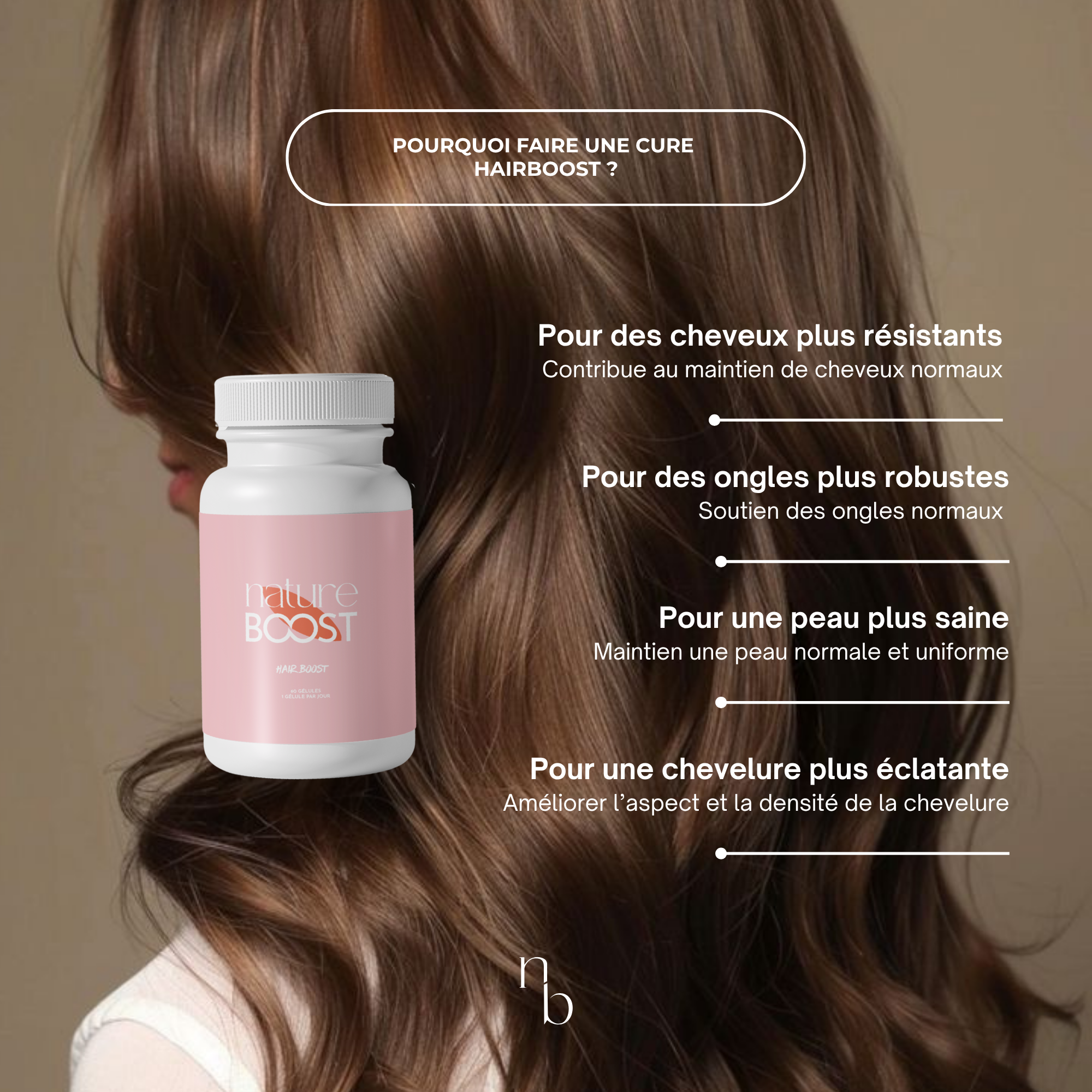 Retrouvez des cheveux plus forts, plus brillants et une peau éclatante grâce à Hair Boost, le complément naturel qui nourrit votre beauté de l’intérieur.